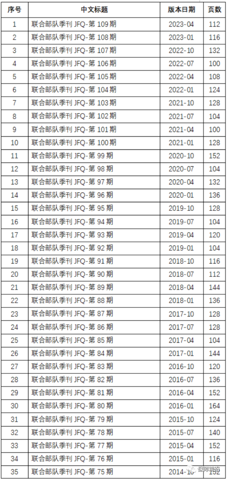 . 联合部队季刊是美国国防大学出版社与美国国防大学联合出版的学术类期刊。该期刊主要是服务美军各个联合作战军种,内容为军事技术、国家战略和联合作战信息和技术为主。该期刊对于研究美军联合作战的理论和发展有着非常高的价值。