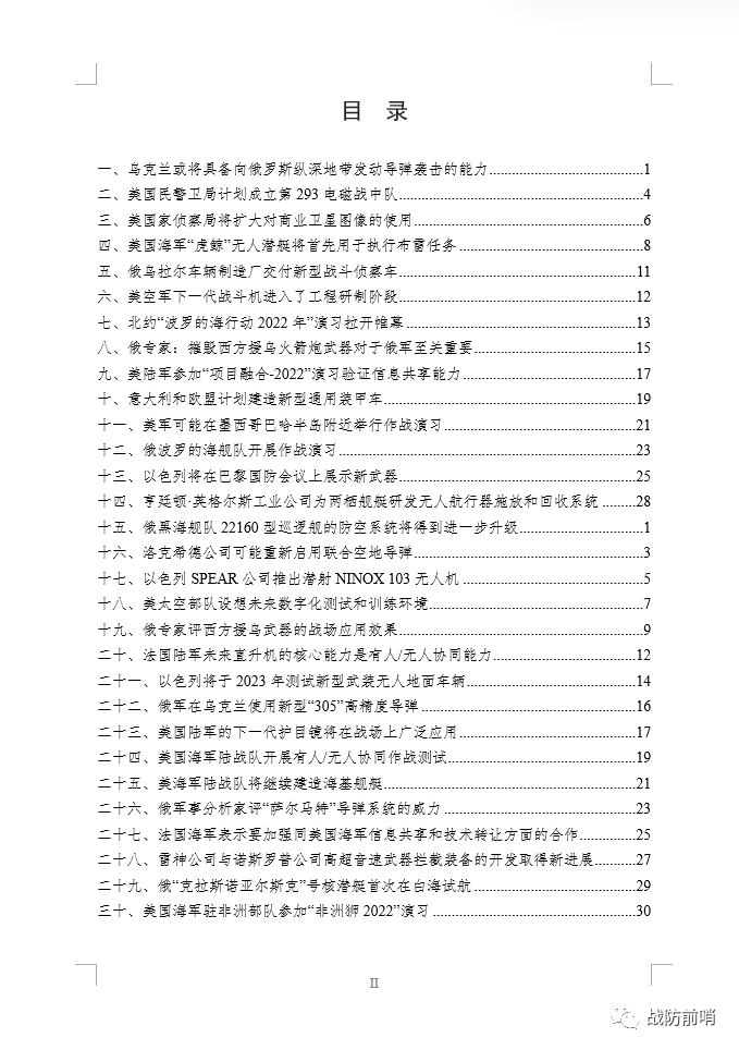 . 《外军最新军情与作战资料汇编(2022年6月资讯)》对6月内全球发生的重大军事动态进行汇总,共三十篇,内容涉及主要军事强国的军情动态、演训追踪、兵器发展以及战略观察。通过这份汇编,可以了解最新的武器装备发展趋势、掌握军事强国的演训情况、解读各国的军情玄机、洞察正在发生复杂变化的国际军事安全形势。