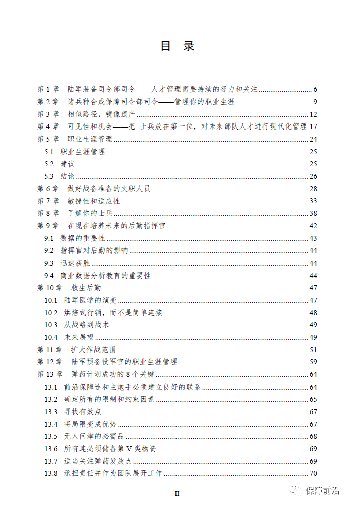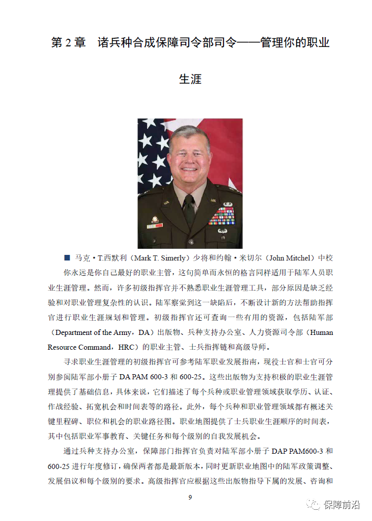 . 人才管理是美国陆军最重要的事项之一,是确保美国持续是世界最强大军队的关键要素。在各级部队正确地管理人才意味着为整个陆军成员的职业生涯提供预测、辅导、咨询、指导等内容,增加培训并改进教育内容,同时提供职业发展机会。为应对人才管理挑战,美陆军强调通过职业军事教育对领导人开展陆军人才管理计划和流程的培训内容,使其充分理解如何在自身及下属的职业生涯中执行人才管理计划。《陆军保障》2022年冬季刊以“职业生涯管理”为主题,介绍了美陆军在招募、培养、部署和留任等不同人才管理的生命周期对陆军人员、预备役军官以及文职人员采取的措施和相关规划。本期文章不仅包括美国陆军装备司令部埃德·戴利上将和诸兵种合成保障司令部司令马克·T.西默里少将等高级将领对职业生涯管理的理解和分析,还有军士长吉米·塞勒斯等基层官兵对职业生涯管理的见解,同时分析了数据分析和人工智能在职业军事教育中的重要作用。此外,本期还包含了在救生后勤、弹药保障领域对陆军及文职人员进行培训管理的分析。