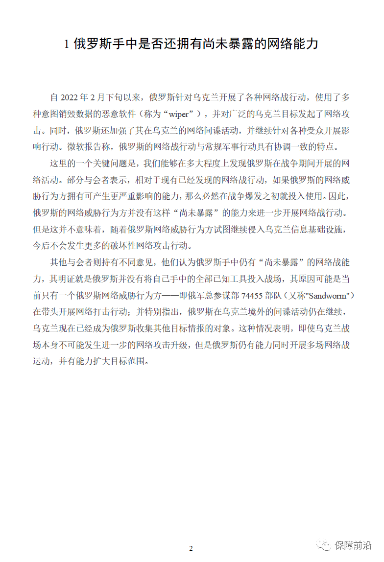 . 事实总是掩盖在迷雾之中——自2022年2月24日俄乌战争爆发以来,俄罗斯在乌克兰战场乃至全球开展的网络战行动至今仍隐藏在深深的迷雾中,基于现在的有限资料,全球各方对网络战的战场效用、应对手段、法律地位、未来发展进行了初步总结、反思和展望;本专题试图在多维度、多角度的开放立场上理解俄乌战争网络战参与方的利弊得失并获取经验教训;本专题收录的文献发表机构主要包括政府机构、国家论坛、重要智库、核心商业公司等,他们的观点有的相互印证但是有的完全向左,这表明即便在美国、欧洲、北约、乃至西方国家阵营内对此问题均持有不同意见。赛斯智库针对战场实际进展情况收集、整理并翻译这一专题,意在帮助读者从不同角度来看待俄乌网络战,并将根据后续需求进行持续更新,现有资料如下:
