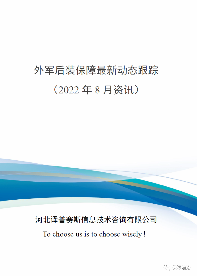 . 本团队基于开源情报信息,围绕外军后装综合保障等方面进行长期跟踪,本汇编选取2022年8月新闻资讯、期刊文章、会议文章共三十一篇,旨在向部队、科研院所、军工企业等单位提供最新的情报信息。