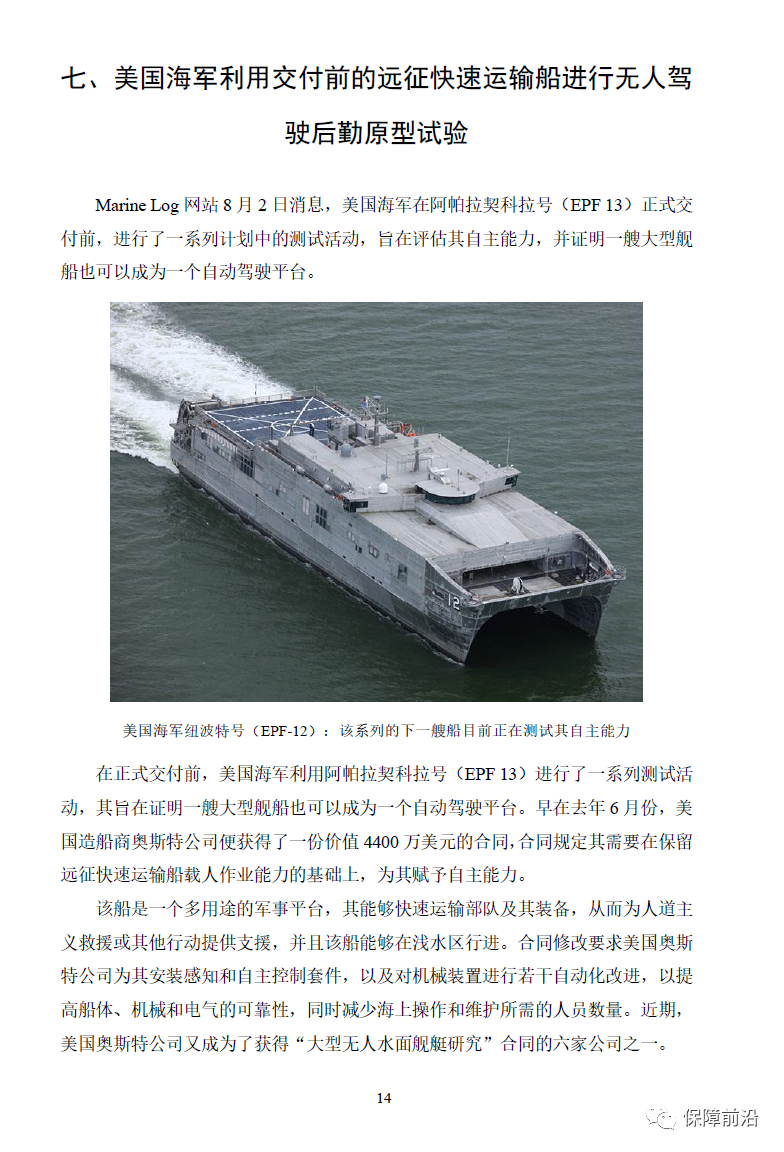 七、美国海军利用交付前的远征快速运输船进行无人驾驶后勤原型试验