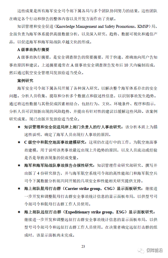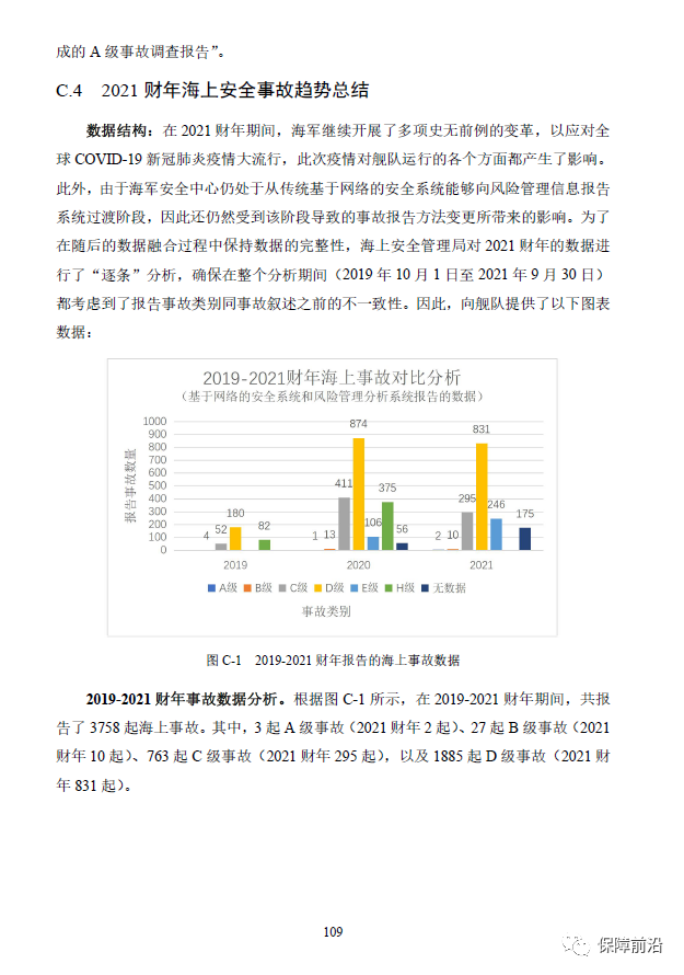 . 本年度报告重点介绍了海军安全中心在2021年取得的进展、趋势和成果。依据2021年制定的3个重点工作方向:即数字化转型、风险管理概念重塑、安全专业发展,海军安全中心对其在安全政策、安全风险管理、安全保证和安全促进方面的工作重点和取得的成果进行了综述。并介绍了海军安全中心下辖单位航空安全管理局、岸上安全管理局、海上安全管理局、远征作战安全局、知识管理和安全促进局和事故调查局年度工作总结,对并对2021年发生的安全事故进行了总结和趋势分析。