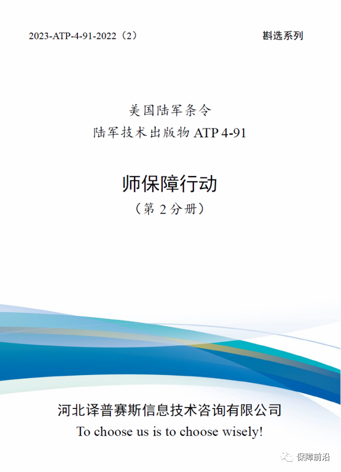 1. ATP 4-91《师保障行动》(原文发布时间2022年11月8日,译文发布时间2023年1月17日);第1分册,73千字,售价1470元;第2分册,86千字,售价1470元。