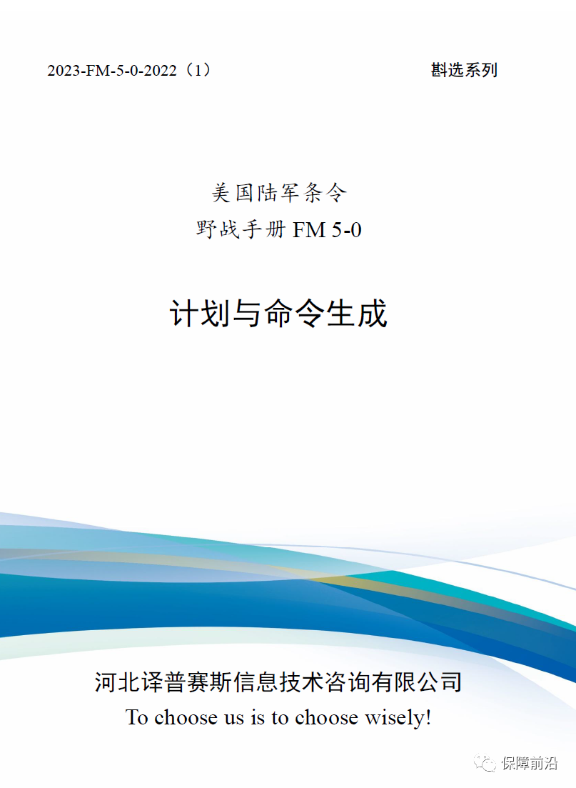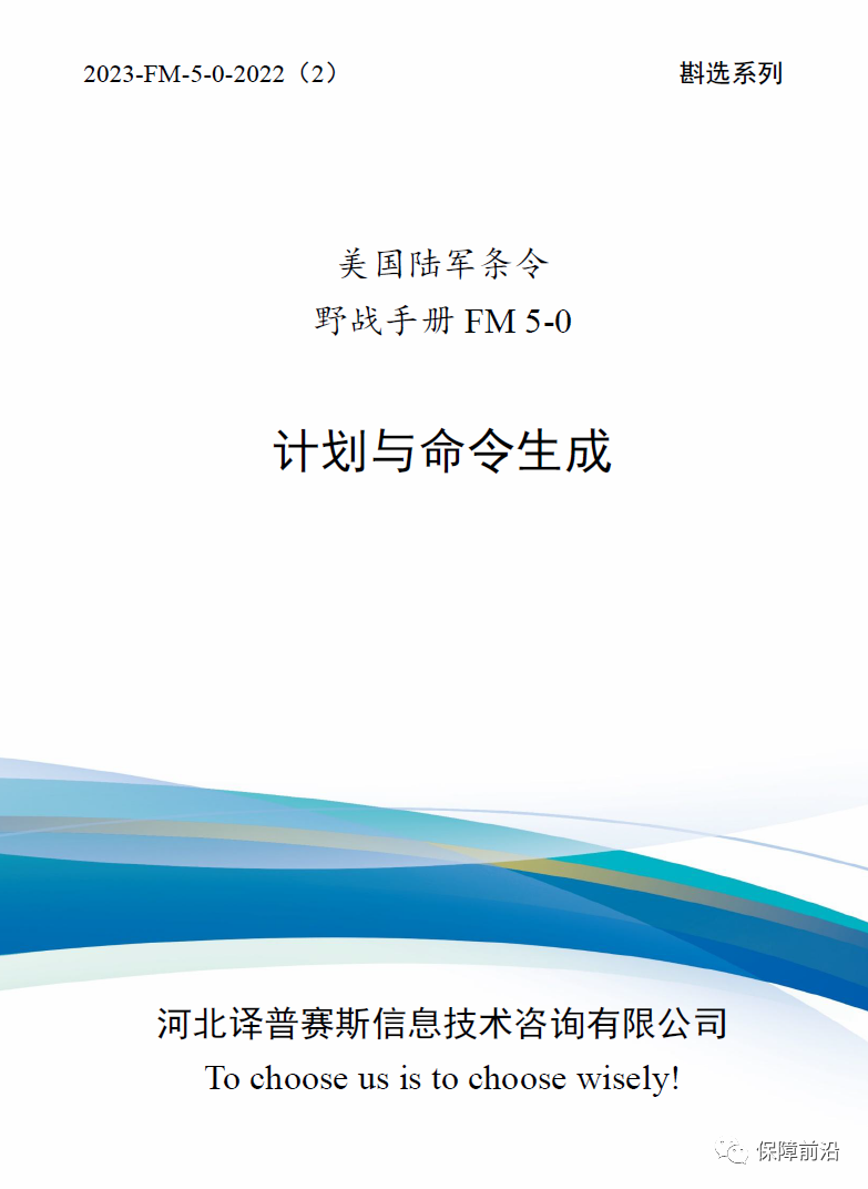 2. FM 5-0《计划与命令生成》(2022)(第2分册)(原文发布时间2022年5月16日,译文发布时间2023年2月7日),全文共计170千字,售价2450元。