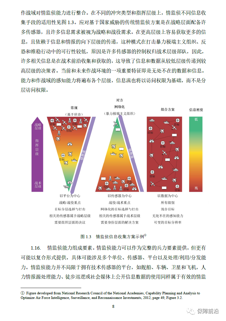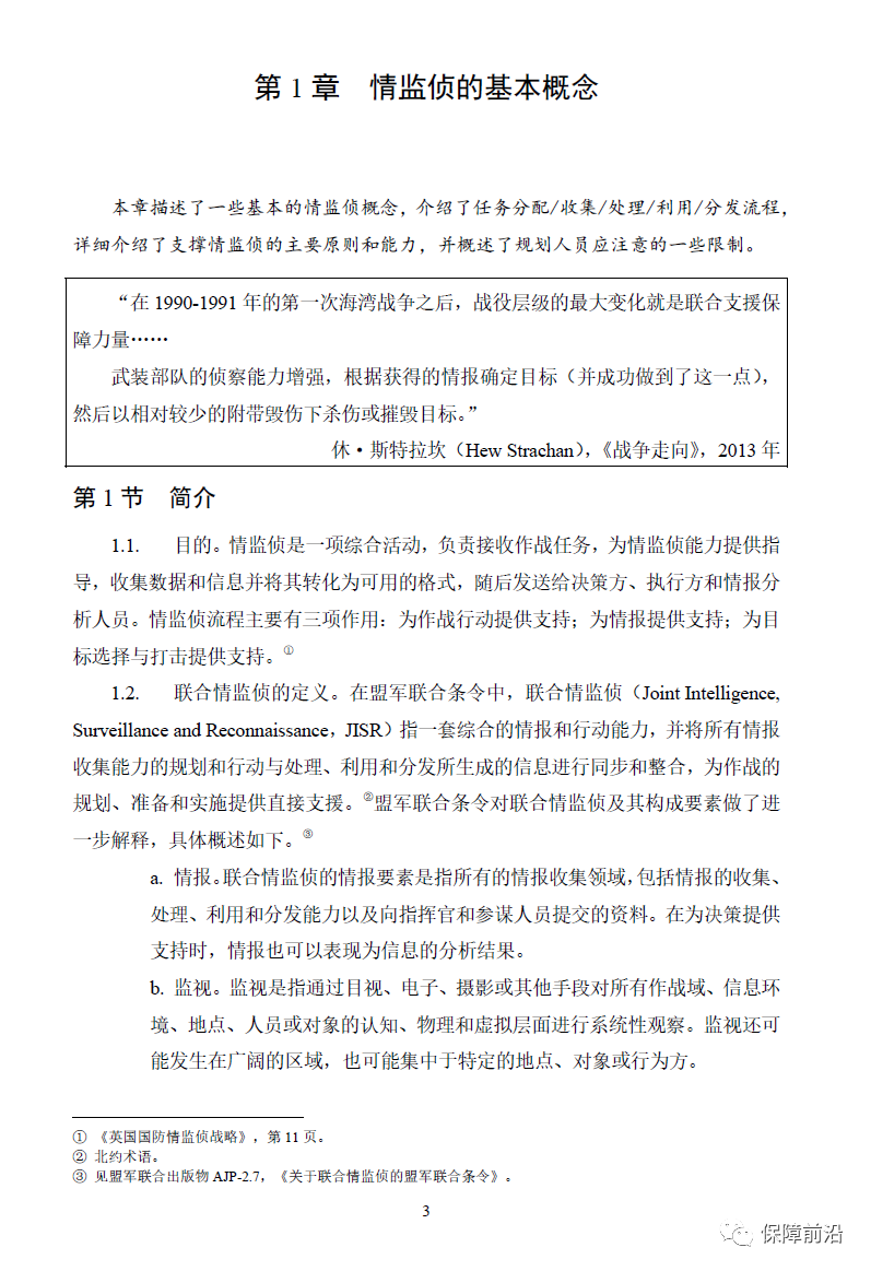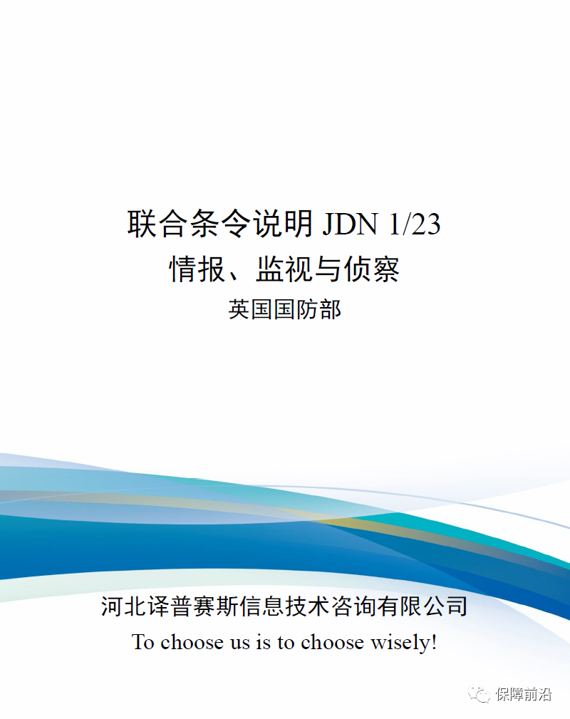 . 盟军联合出版物AJP-2.7《盟军联合情报、监视与侦察条令》,详细介绍了北约联合情报、监视与侦察流程。英国继续发布国家情报、监视与侦察条令的决定,表明在《英国国防情报、监视与侦察战略》发布后,各方希望英国提供更多关于情报、监视与侦察方案的重要细节。英国联合条令说明JDN 1/23《情报、监视与侦察》尝试提供情监侦领域当前和未来的概念,并将现有条令和最佳实践结合起来。本篇联合条令说明具有探索性意义,包括一些尚未达成一致的原则和概念。本书第1章介绍了几个基本的情监侦概念,包括任务分配、收集、处理、利用和分发;第2章描述了任务分配的核心要素,详细介绍了任务分配的关键作用;第3章介绍了任务分配/收集/处理/利用/分发流程中的信息收集工作,包括信息收集的特点和方法,同时还介绍了信息收集活动的规划和实施;第4章描述了信息的处理、利用和分发以及具体的实施流程;第5章介绍了基于活动情报的以问题为中心的情监侦,《英国国防情监侦战略》将此种方法确定为未来执行情监侦任务的首选方法。本章还研究了自动化、人工智能和机器学习;第6章介绍了更广泛作战规划中的情监侦实施流程。