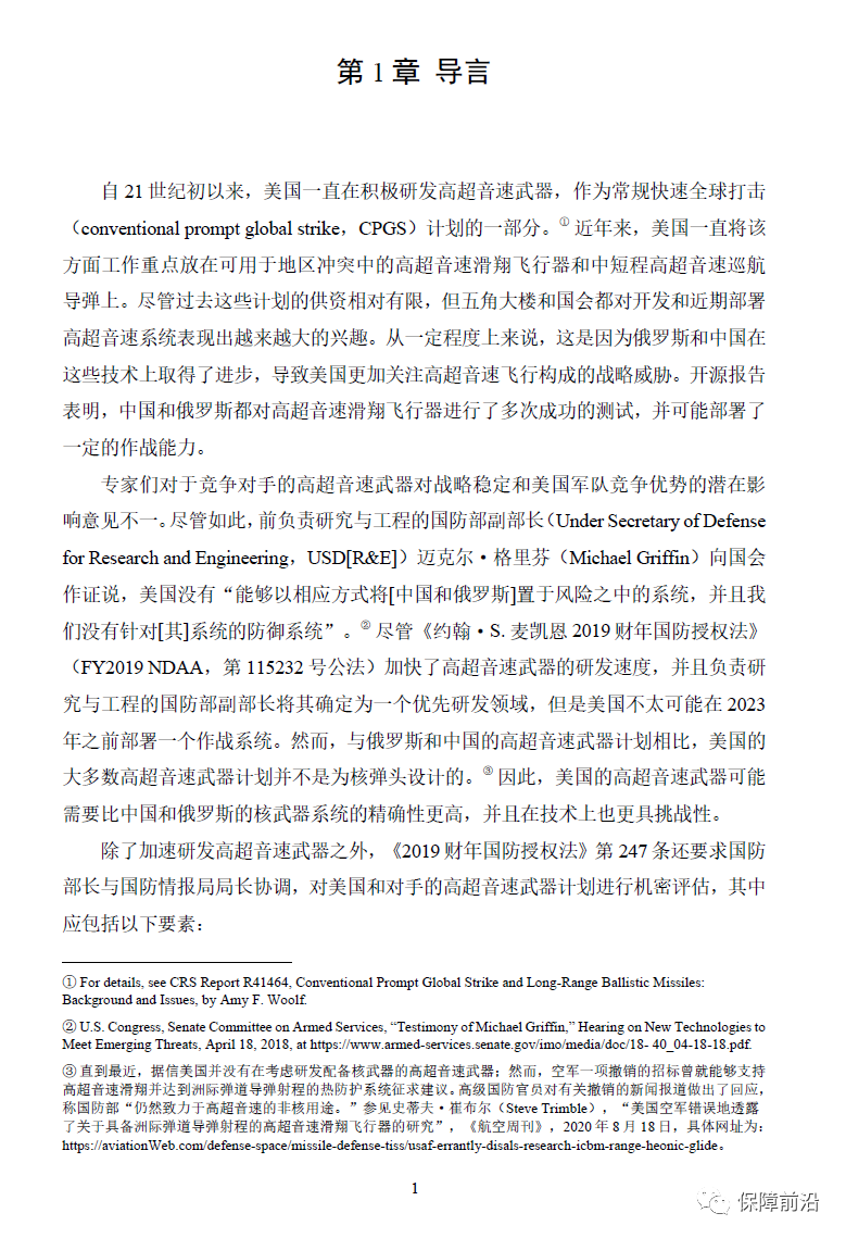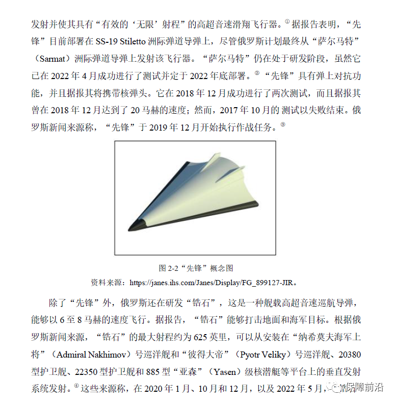 . 2023年1月,美国鉴于其相较中国与俄罗斯在高超音速武器领域不具备战略优势局面,国会研究处公布了名为《高超音速武器:国会背景及议题》的国会报告,研究了考虑高超音速武器的理由依据、预期成本及其对战略稳定和军备控制的影响等问题。报告首先着重梳理了美俄中高超音速武器研发计划与基础设施建设情况,特别是美国各军种、研究局的研发计划以及高超音速导弹防御问题。此外,介绍了国会议题中任务要求、供资和管理考虑因素、工业基础和供应链、战略稳定以及军备控制基本问题情况,对高超音速武器研发的具体问题进行了界定,进一步促进美国高超音速武器研发。