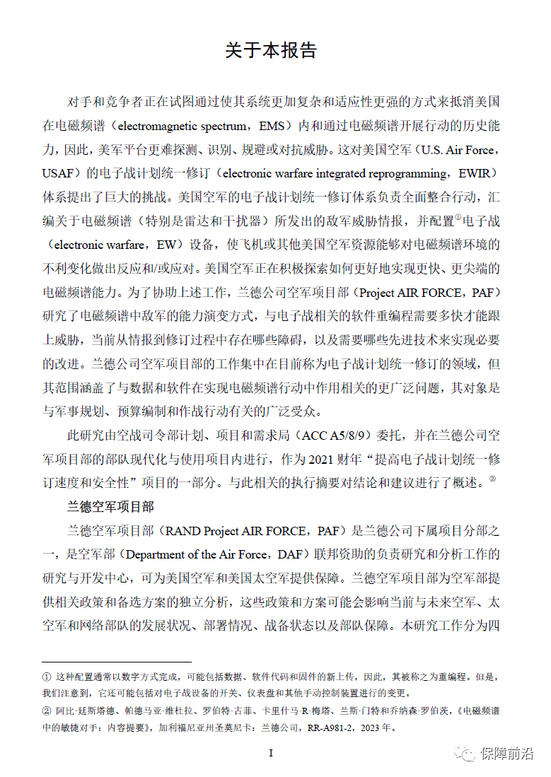 . 2021年9月,受美空战司令部计划、项目和需求局委托,兰德空军项目部发布了一份题为《在电磁频谱战中智胜敏捷对手》的报告,并将其作为2021财年“提高电子战计划统一修订速度和安全性”项目的一部分,目的是为未来空军、太空军和网络部队的发展状况、部署情况、战备状态以及部队保障提供相关政策和备选方案。该报告分为四个部分:分别是战略和条令,部队现代化和部署使用,资源管理,劳动力、发展和健康。报告的各部分概述了当前电子战修订计划和未来电子战修订愿景,认知电子战、云集成和数据工程、飞行计划软件和容器化微服务、机载高性能计算的概念、内容和未来发展态势,并依托情景展望未来电子战能力。根据该报告,美空军应加速整合实现认知电子战所需的技术,并立即采取措施,采用新的软件部署架构,以便能够更快进行能力部署。