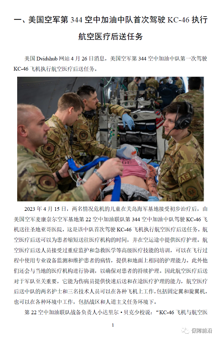 一、美国空军第344空中加油中队首次驾驶KC-46执行航空医疗后送任务