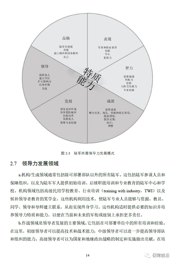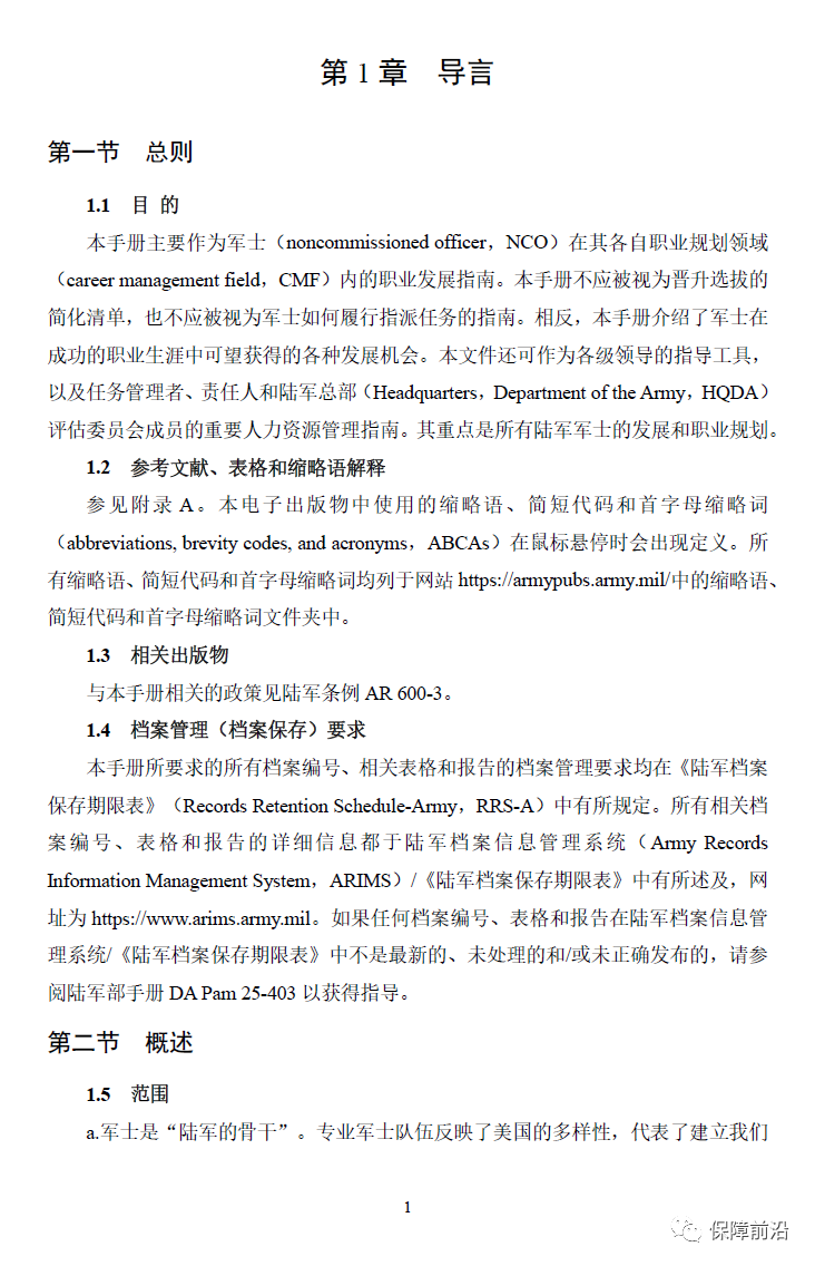 . 军士是美国陆军的骨干,为确保发挥其作用,美国对其职业发展相关政策不断完善,最新修订的《陆军军士职业发展指南》是指导军士职业发展的重要文件。文件强调在机构、行动和自我发展领域培养军士领导力,并为军士的培养和晋升提供了一系列方法和参考。