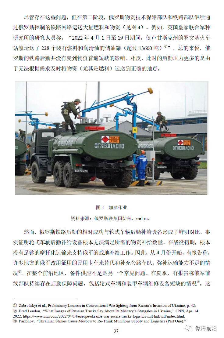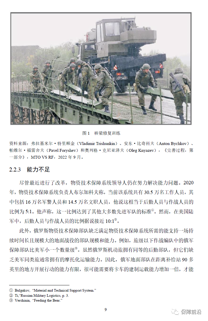 . 2023年9月29日,海军分析中心的研究院保罗·舒瓦兹等发表了一篇名为《俄乌冲突中的俄罗斯军事后勤:近期改革与战时作战》的报告,报告中指出自2010年以来,俄罗斯的军事后勤系统进行了一系列的改革,并对俄乌冲突中俄罗斯后勤部队的表现进行了点评,其认为俄罗斯后勤部队早期表现不佳,但总体上是成功的。