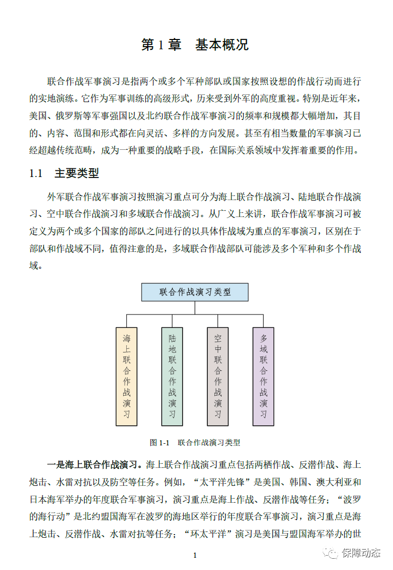 第1章,对外军联合作战演习的主要类型进行梳理,分析美国、北约以及其他国家的联合作战演习的发展现状,并在此基础上总结提炼了外军联合作战演习的特点。