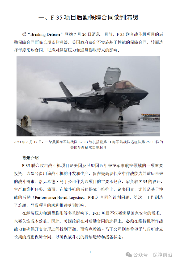 一、F-35项目后勤保障合同谈判滞缓