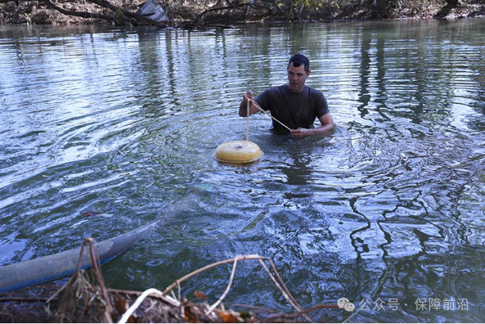 图2 2024年10月6日,第169师持续保障支援营A连的水处理专家、一等士官杰森·理查兹在山城罗恩溪安装战术水净化系统进水软管
