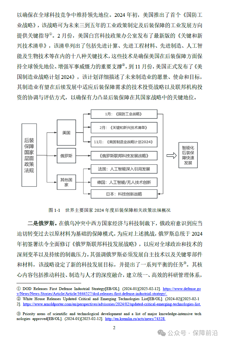 . 本报告系统梳理了2024年度外军后装保障领域的最新发展动态,重点分析了智能化技术在后装保障中的应用突破、新装备研发进展以及实战化应用案例。通过对这些内容的深入剖析,本报告旨在揭示后装保障领域的发展趋势,为我军后装保障的智能化转型提供参考和借鉴。未来,随着技术的不断演进和战争形态的持续变化,智能化后装保障将成为决定战场胜负的关键因素之一,其重要性将愈发凸显。