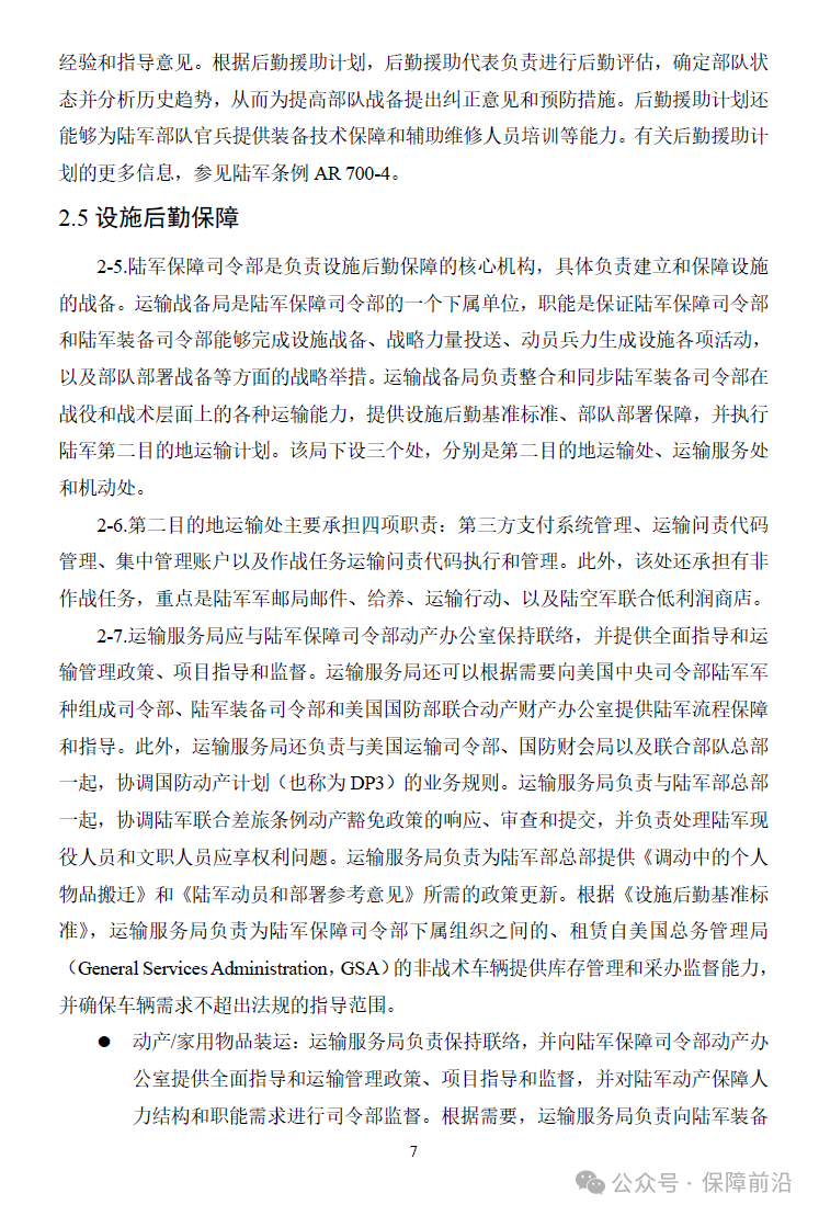 . 陆军保障司令部是美国陆军装备司令部的下属司令部,通过陆军野战保障旅、陆军野战保障营和后勤战备中心等司令部建制机构的方式,整合和同步向受援的陆军军种组成司令部、军、师和设施提供陆军保障司令部的装备体系能力;并负责在需要的位置上向陆军作战部队提供装备和物资保障,为美国陆军承担的全球力量投送任务提供支援,并协助将后勤文职人员扩编计划能力整合到军事行动中。