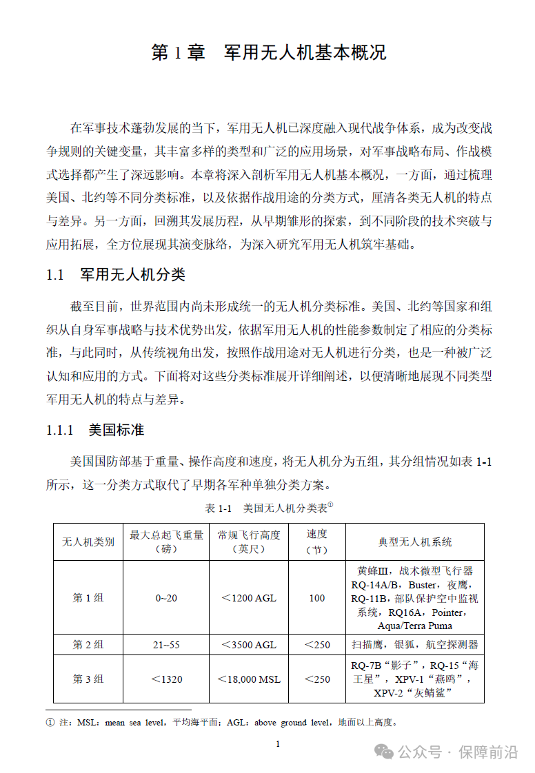 . 第1章:军用无人机基本概况。聚焦军用无人机基本概况,对其分类方式进行详细阐述,同时梳理了从早期雏形到现代先进无人机的发展历程。