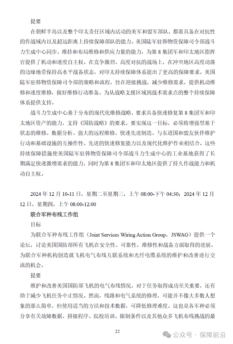 .       除了本《美国国防部2024年维修研讨会》大会介绍手册外,我们还将提供全体会议、分组专题会议、相关会议以及“美国国防部2024年武器系统软件峰会”的PPT以及《美国国防部2024年维修创新挑战赛》手册译本,详情咨询赛斯智库工作人员。