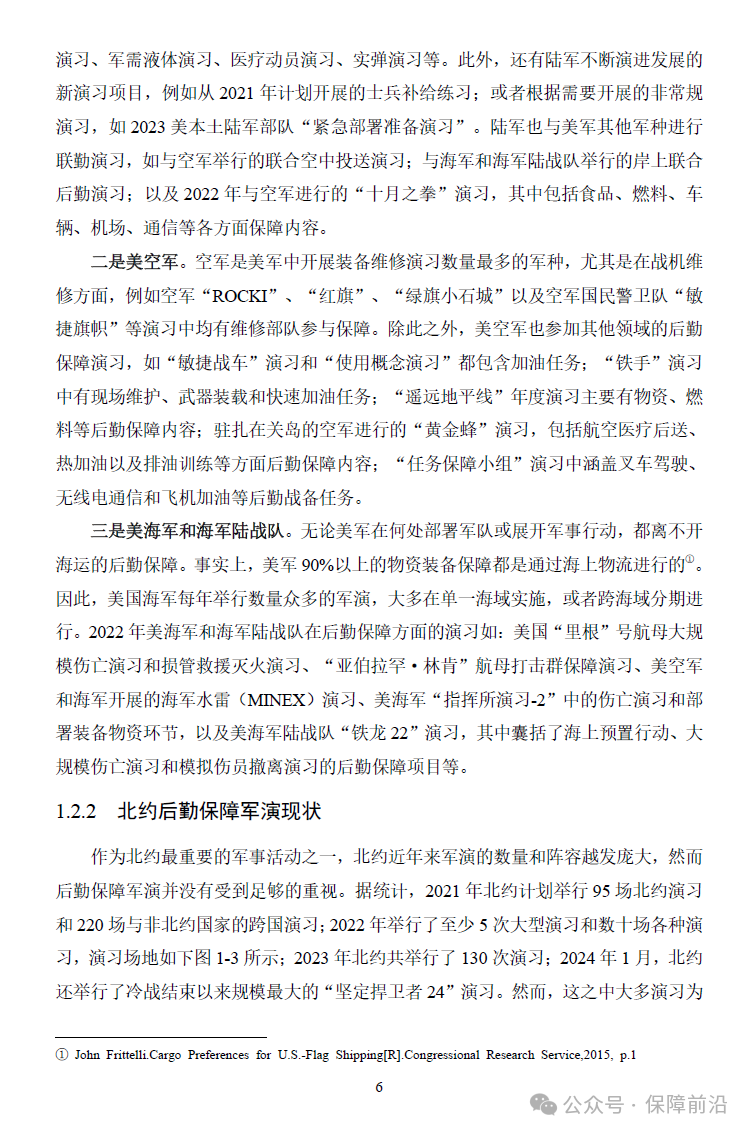 第一部分(第一章):基本概况。在这一部分,本报告主要总结说明了美国、北约和俄罗斯这三大军事力量的后勤保障军演情况,具体包括主要类型、演习现状和主要特点。