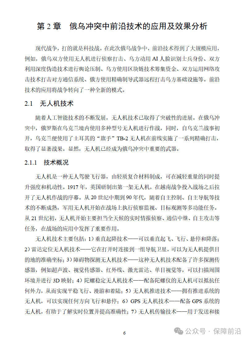 . 科技是现代战争的核心战斗力。从这场战争中,我们可以看到俄乌双方运用了多种前沿技术,例如,无人机技术、人脸识别技术、深度伪造技术、网络攻击技术、精确制导技术等。先进的技术不仅具有强大杀伤力,还具有强大震慑力,甚至影响着战争的发展走向。当前,面对日趋激烈的大国战略竞争和权益博弈,世界军事强国都在抢占科技制高点,提升本国军事实力。本报告通过对俄乌冲突中的前沿技术应用进行总结,并对其效果进行分析,旨在为我军未来战略前沿技术的发展提供一定参考。