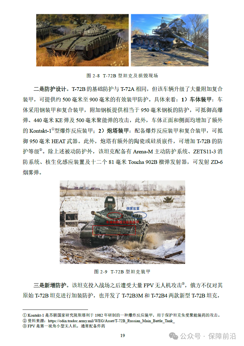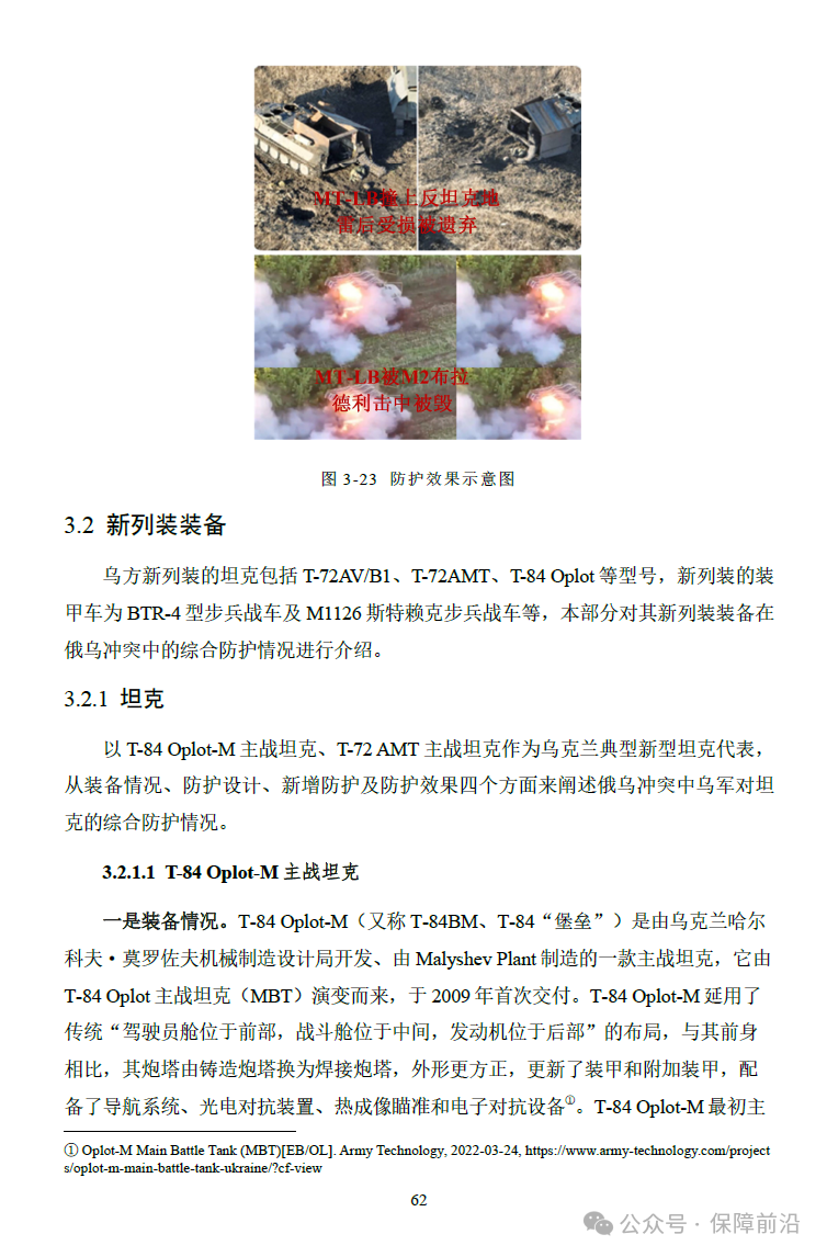 . 第2部分:俄、乌装备综合防护典型案例。坦克和装甲车是战场上重要的作战装备,本部分以俄罗斯和乌克兰老式装备和新式装备作为区分,分别选取典型的坦克和装甲车型号,介绍装备情况、防护设计、战场新增防护及防护效果。除大型作战装备外,个人防护同样是战场防护的重要部分,因此将对俄方与乌方使用的个人防护装备及防护效果进行介绍。最后,总结战场上俄罗斯与乌克兰装备的总体防护效果。