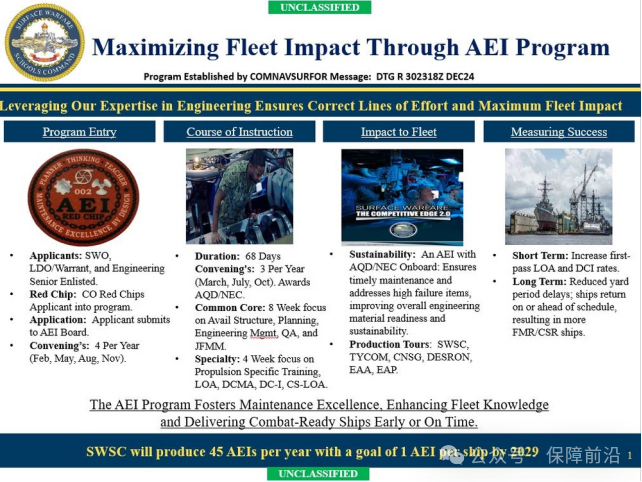 . AEI计划为符合条件的水面战军官、高级准尉、有限值勤军官和高级工程士官提供了一个独特的机会,使其能够成为各自领域公认的专家。该计划旨在通过培养工程领域专家,提升舰队工程知识和训练水平,增强舰队战术准备。事实证明,该计划确实促进了维修工作的卓越性,增强了舰队的知识储备,并使作战舰艇能够提前或按时交付。目前,SWSC计划每年培养45名AEI,目标是到2029年每艘舰艇都配备一名该人员。