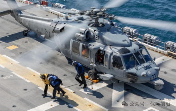 2025年3月,两栖攻击舰“硫磺岛”号上的海军人员在航行中尝试用绳索勒住MH-60S“海鹰”直升机以将其转移到安全地带