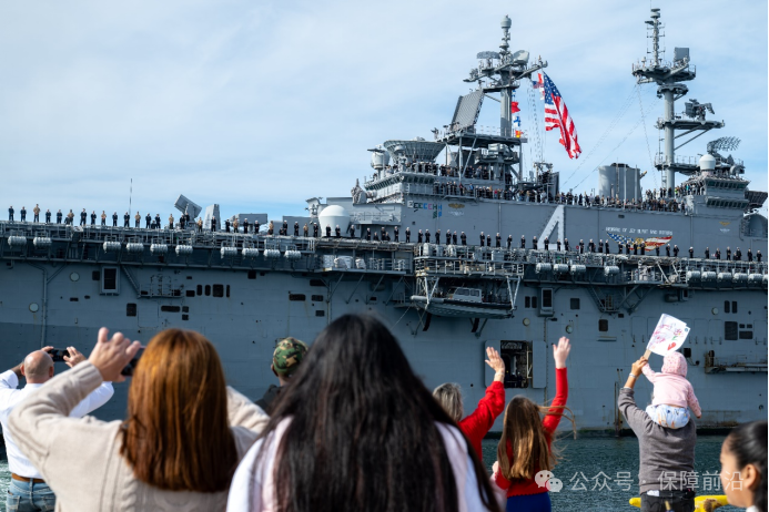 2024年11月24日,水手和海军陆战队员在返回圣地亚哥海军基地的“拳师号(USS Boxer)”两栖攻击舰的甲板上站岗,引发群众围观