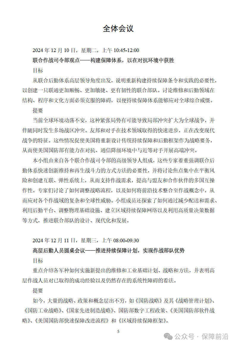 . 此次会议分为全体会议、分组专题会议、技术焦点会议、相关会议、专题学习会、参观项目,以及“美国国防部2024年武器系统软件峰会”、“国防部长维修奖”颁奖仪式、“维修创新挑战赛”决赛和“美国国防部2024年维修与后勤展览会”。