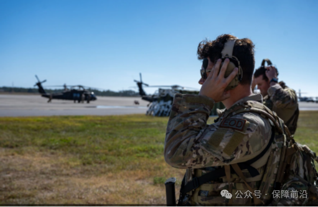 11月4日,在佛罗里达州赫尔伯特机场举行的一次演习中,一名隶属于第一特种作战土木工程中队爆炸物处理小组的美空军士兵在登上MC-130J“突击队Ⅱ”运输机前佩戴听力保护装置