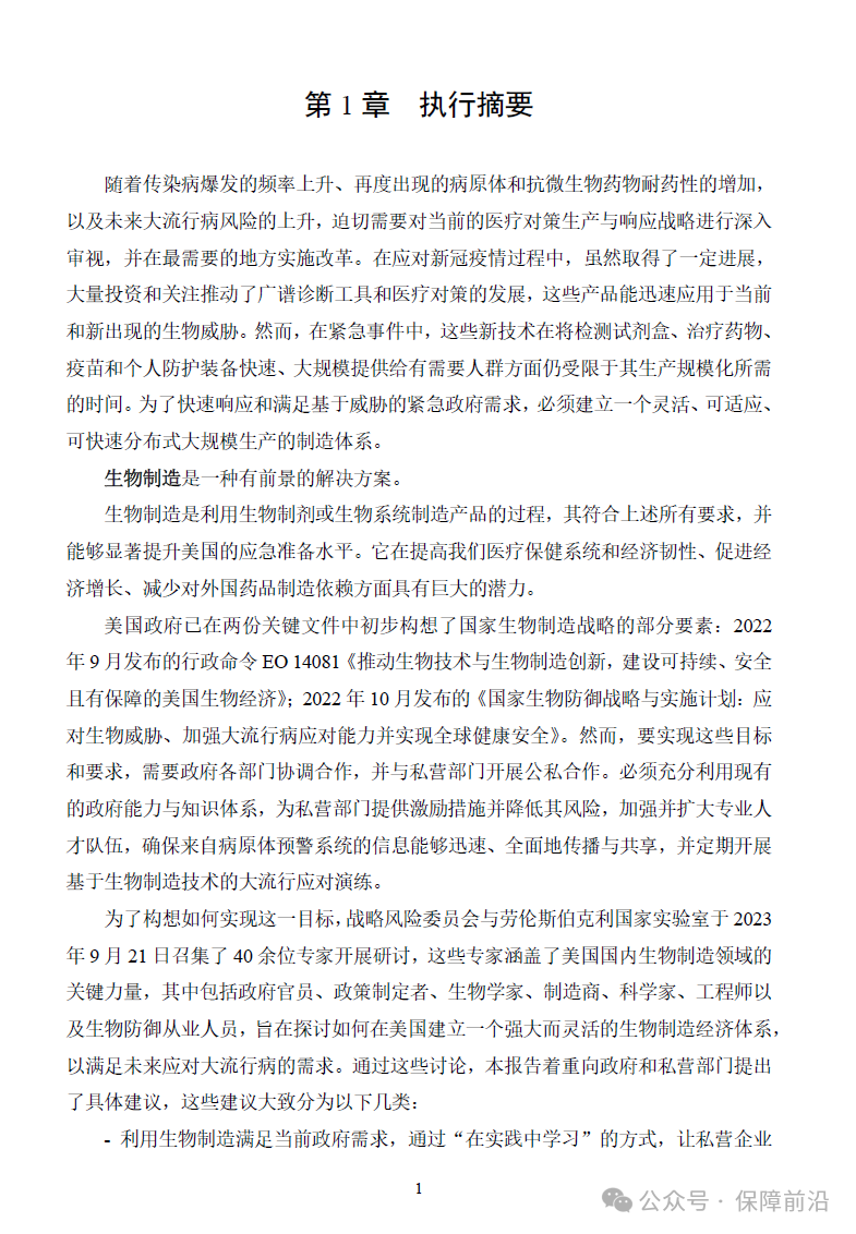 . 报告基于战略风险委员会与劳伦斯伯克利国家实验室召开的专家研讨会成果,分析了当前生物制造面临的主要挑战,包括供应链脆弱、研发持续性不足、商业模式不成熟、政府协同机制缺位、公众信任缺失、人才储备短缺及长期投资缺乏等问题。为解决这些难题,报告提出包括建立公私合作机制、完善监管流程、加大财政激励、前置部署关键物资、加强人才培养、整合跨机构资源和开展演练等十余项政策建议,并强调需在未来三年内落实,确保美国在下一次生物威胁中具备更强的应对能力和战略弹性。