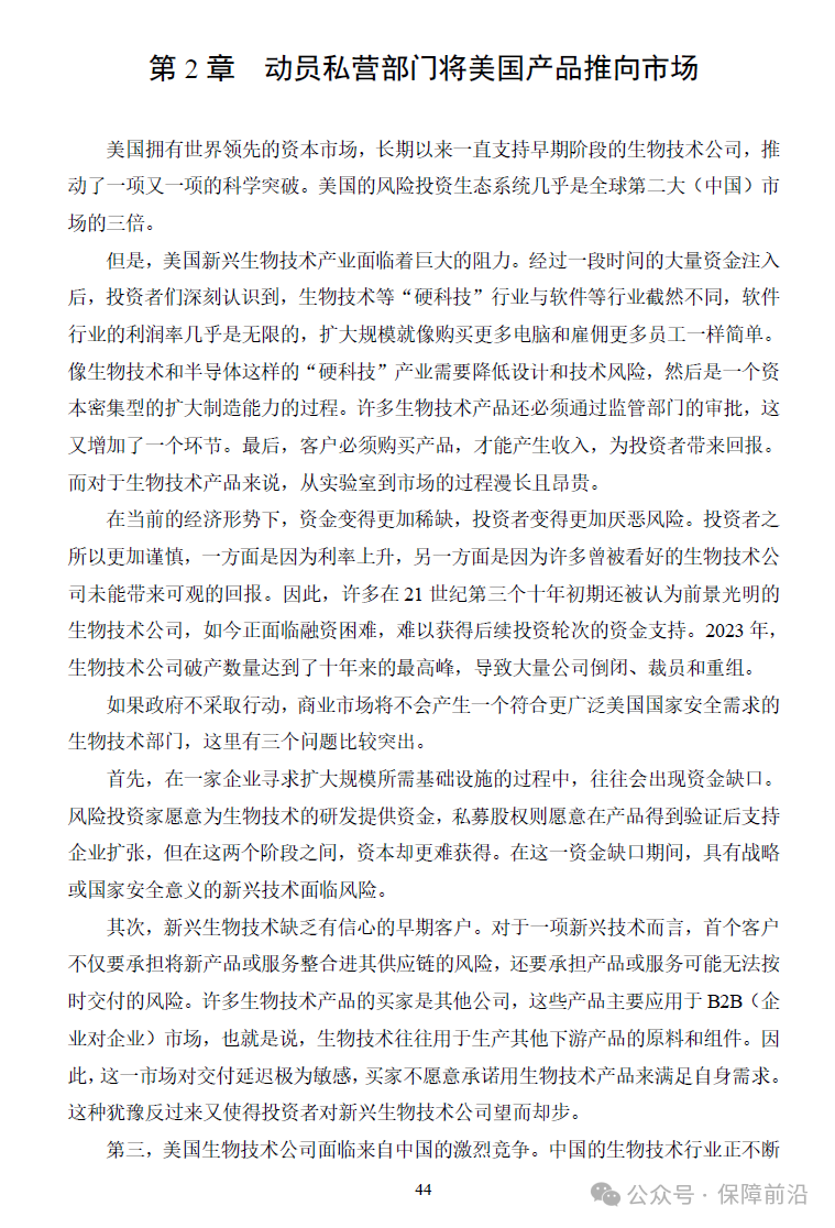 . 为此,报告提出六大支柱性建议:一是将生物技术确立为国家优先事项,设立国家协调办公室;二是动员私营部门,推动生物产品商业化;三是在国防领域发挥生物技术最大优势,建立道德使用框架;四是保护战略性生物数据,防止对手利用;五是打造高水平生物技术人才队伍;六是联合盟友和伙伴,共同推动全球生物技术规范与发展。该报告强调,美国应充分利用本国的开放创新体系、资本市场和人才优势,同时对中国的非市场行为进行有力回应,保护自身技术和安全利益。报告建议未来五年内美国政府投入至少150亿美元,引导私人资本参与国家级生物技术战略,确保生物技术造福人类而非成为敌对国家的武器。