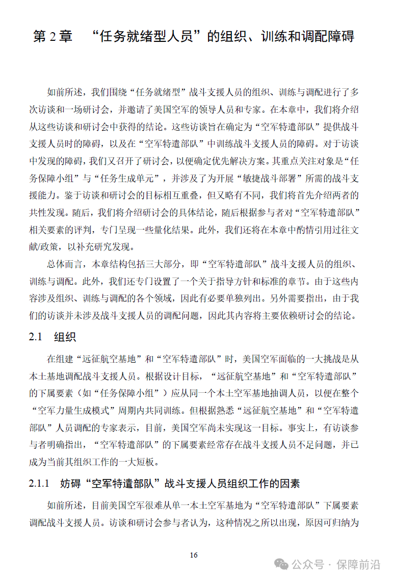 . 兰德公司在研究中发现,这一领域存在九大问题,如“部分联队没有设置训练与精进标准,导致战斗支援人员的培养缺乏重点”和“对‘任务保障小组’与‘任务生成单元’的业务关系,有关方面理解混乱”等,并提出了一系列改进建议。这些内容为研究美国空军组织制度、人员培养等提供了宝贵启示,并有助于了解美国空军最新的部署模式。